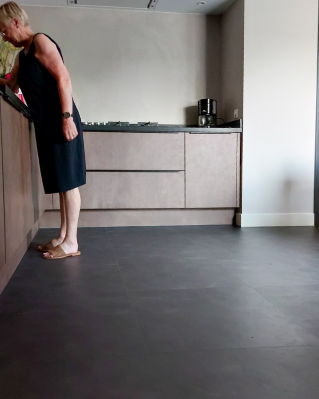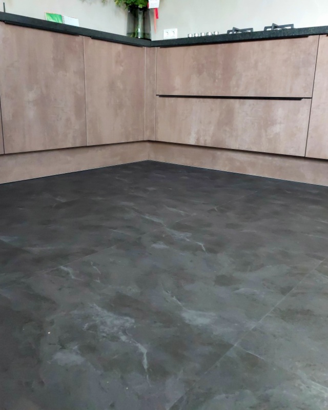 De vloer moest gestoffeerd worden met een pvc tegel en dan graag een betonlook. Na een diverse stalen te hebben gezien hebben de klanten gekozen voor de pure tile 60 x 60 tegel. De keuken krijgt hierdoor een echte betonlook vloer.