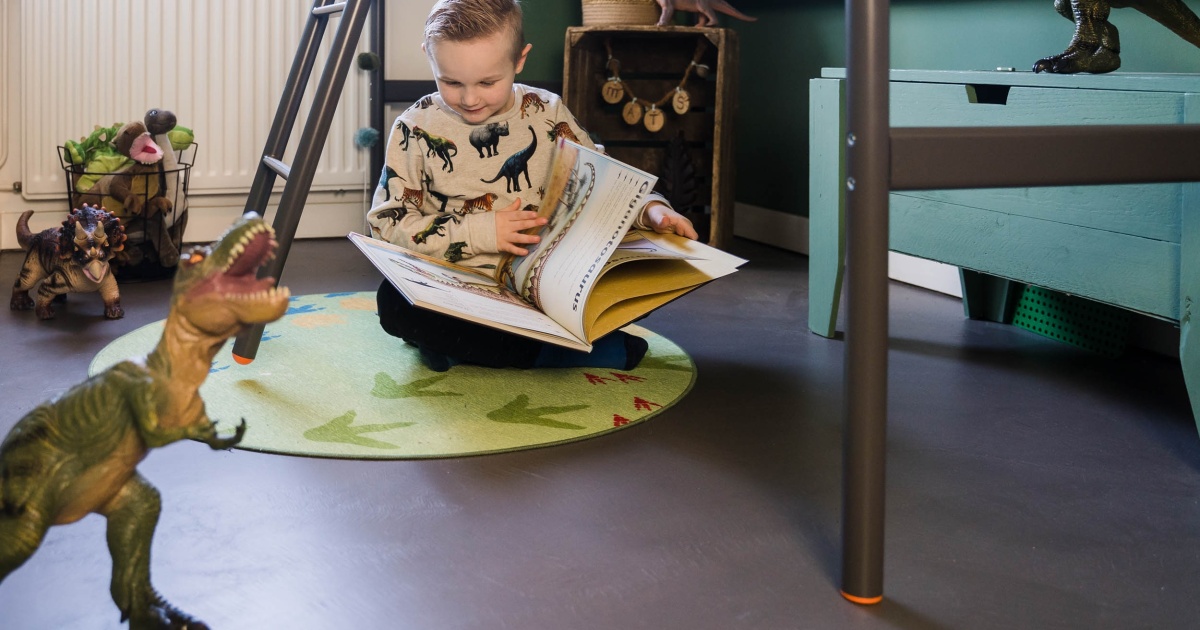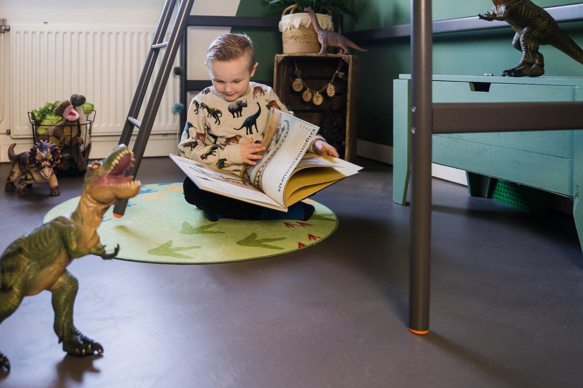 Een dino kinderkamervloer waar de familie heeft gekozen voor de kleur Mud. De kleur Mud is een donker grijze tint en dit past perfect bij deze kamer. De zoon des huize is ook helemaal happy in zijn slaapkamer. Nu kan hij heerlijk spelen in zijn dino kamer met een "modder" vloer.