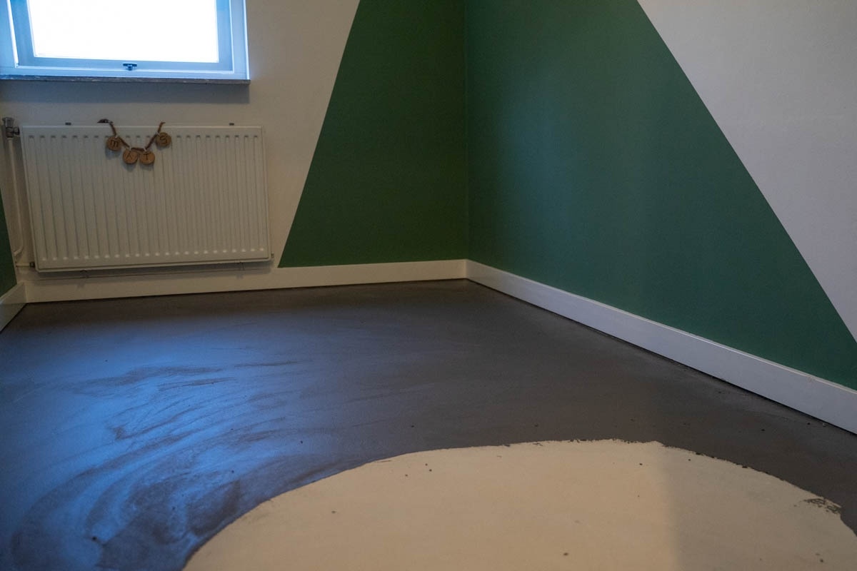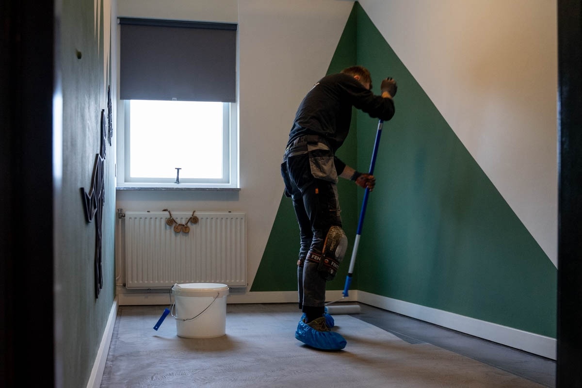 Na een droogperiode van een aantal dagen kunt u de kamer weer inrichten en genieten van de betonstuc vloer.